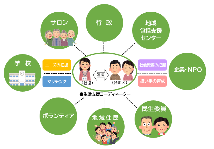 生活支援体制整備事業では、年齢を重ねても“住み慣れた地域で安心して暮らし続ける”ことができるよう、地域にお住まいのみなさんをはじめ、行政、ボランティア、民間企業、協同組合などの多様な団体と協力し合いながら、健康の維持・増進に向けてお互いに支え合う地域づくりを目指しています。